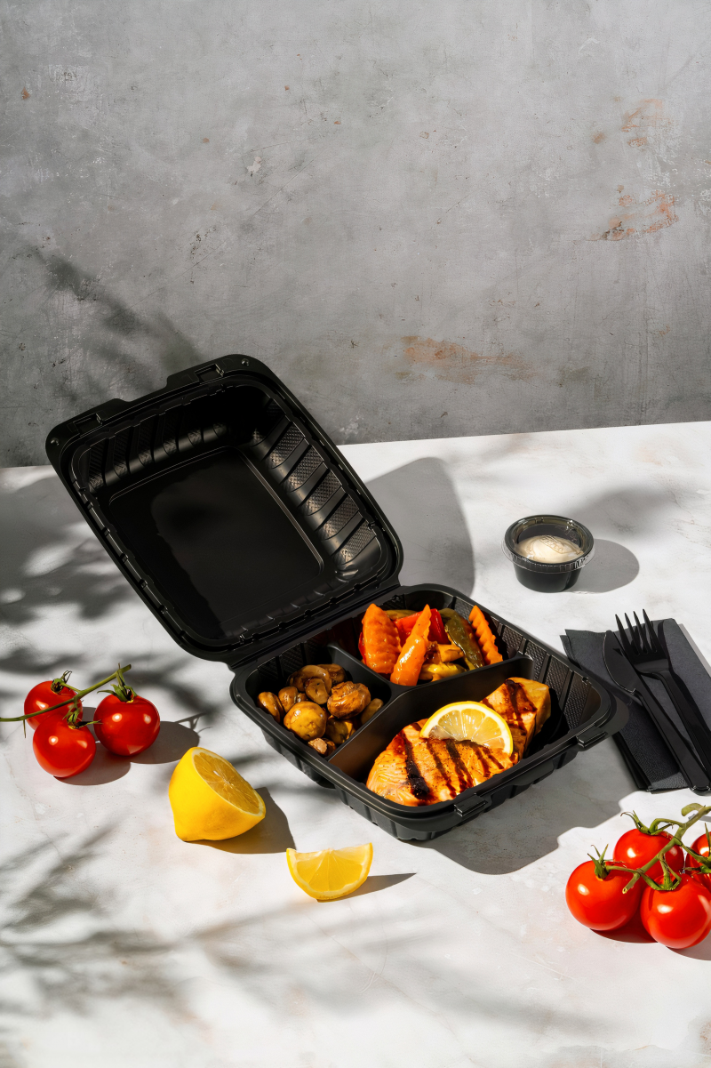 Чорні контейнери з трьома відділеннями не лише функціональні, а й стильні. Їхній сучасний дизайн підкреслює презентабельність вашого закладу та допомагає виділитися серед конкурентів. Така харчова упаковка стає потужним інструментом маркетингу: фотографії ваших страв у соціальних мережах привертатимуть увагу клієнтів і підвищуватимуть лояльність до вашого бренду.